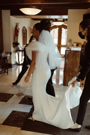 The couple opted to rent fam tables and chairs to get the feel of the warm intimate celebration they were going for. The venue provided assorted plats, we added burnt orange napkins, garland, wine bottles, and wine cork place cards to create a rustic, yet elegant table scape. They served a family-style feast, which was the perfect menu for a cold February evening.